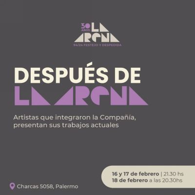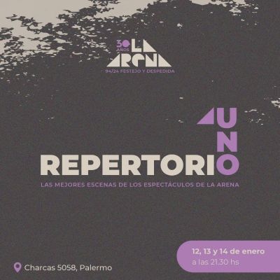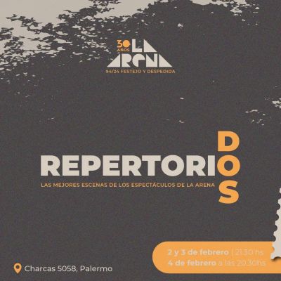 REPERTORIO 2 〰️ 📆 Viernes 2 y Sábado 3 de febrero a las 21 30hs. Domingo 4 a las 20.30hs 🔜 Con motivo del festejo de los 30 años de La Arena, remontamos las mejores escenas de cada uno de los espectáculos y las volvemos a presentar. Les artistas “originales” que las crearon y actuaron al momento de su estreno, se las enseñaron a artistas emergentes como legado artístico y este fin de semana las “reviven” en 3 funciones. 💫 Se presentan escenas de los espectáculos: Travelling, Gala, Fulanos, Sanos y Salvos, Mutuo, Leonardo, Tiempos que corren y Vibra. 🪄 Dirigen: Carolina Della Negra, Luciana Mosca, Florencia Micha, Lorena Diaz, Florencia Montaldo, Mané Stancato, Luciano Martín, Mariana Zarabozo, Iván Ripari, Paula Basso, Lucas Bustos, Flor Gropp, Pablo Prámparo.